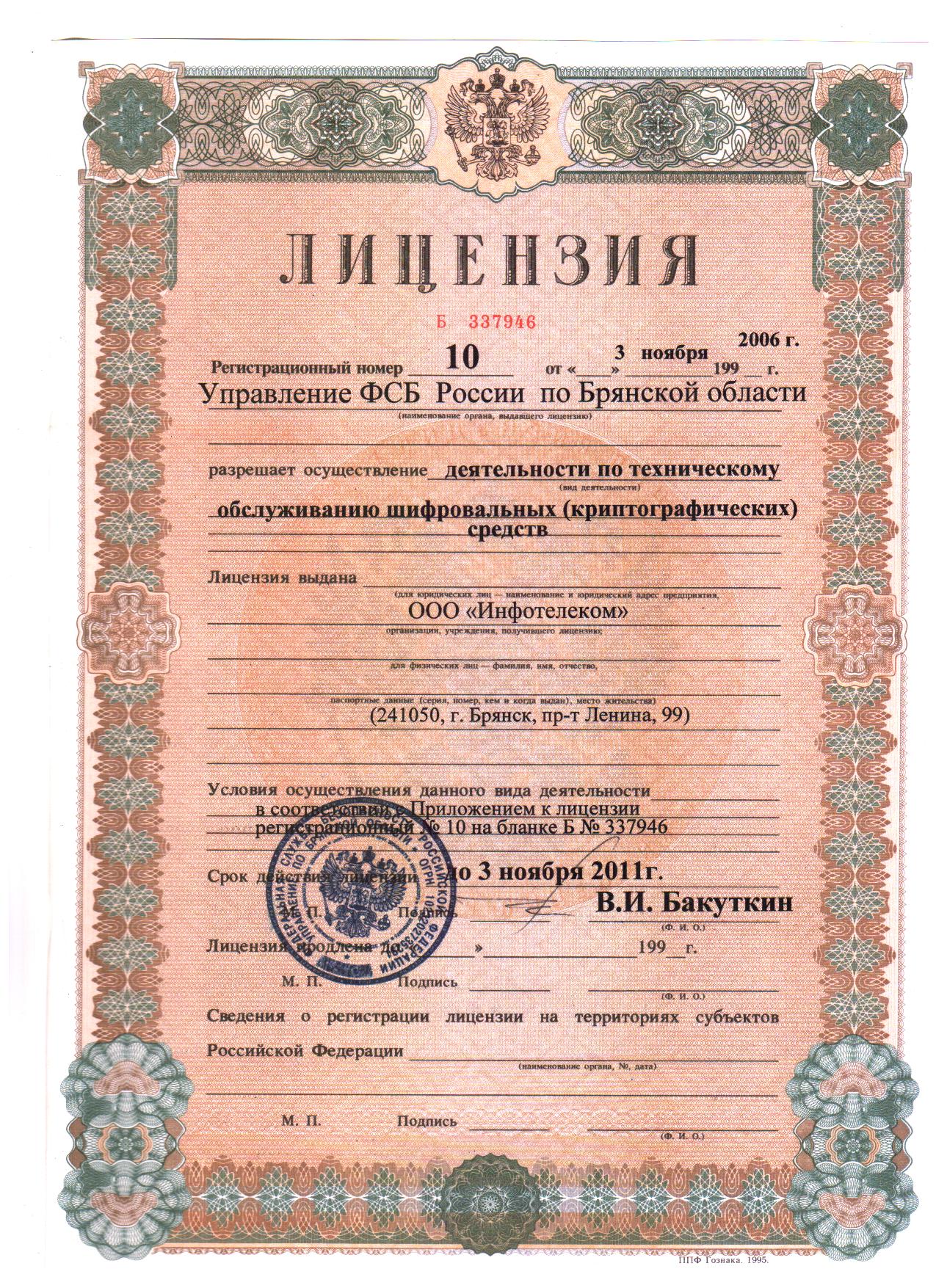 Лицензия ФСБ Б №337946 от 3 ноября 2006г.